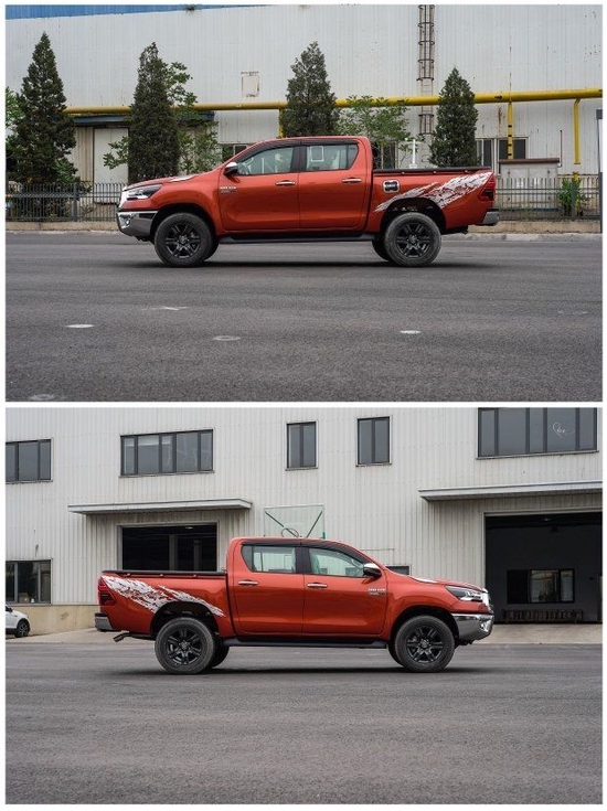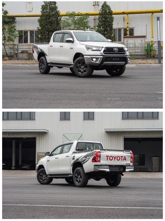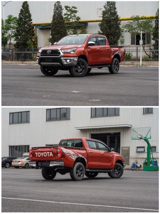 22款丰田海拉克斯2.8T柴油版 全新的发动机罩,进气格栅,前大灯和前保险杠,尾灯现在采用了玻璃光学系统。前保险杠下部更加突出,而后保险杠增加了全新的拖车横梁,使受力更加均匀,更适合野外生存。这部车给人的第一感觉就是高大威猛,拥有宽大硬朗的车身,强健有力,外张的挡泥板尽现强悍风格,视觉上极富冲击力。