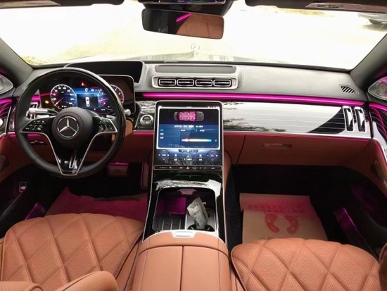 2023款奔驰迈巴赫S580 4MATIC内饰方面:全新迈巴赫S580的内饰走的是科技路线,新车采用了三幅式的全新造型的方向盘,新车的中控台上采用了钢琴烤漆面板装饰,上面采用了多条横向的白色装饰条点缀。