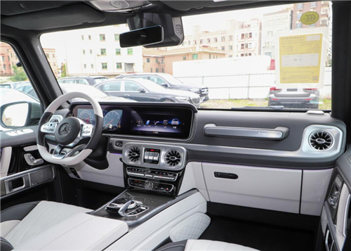 2022款奔驰G500中控台多处均采用碳纤维材料,带彩色TFT显示屏的AMG仪表盘、AMG主菜单和单独的挡位显示器以及采用白色照明的AMG门槛。名贵的选材及精湛的内装令人拍案叫绝。