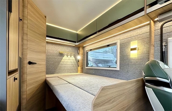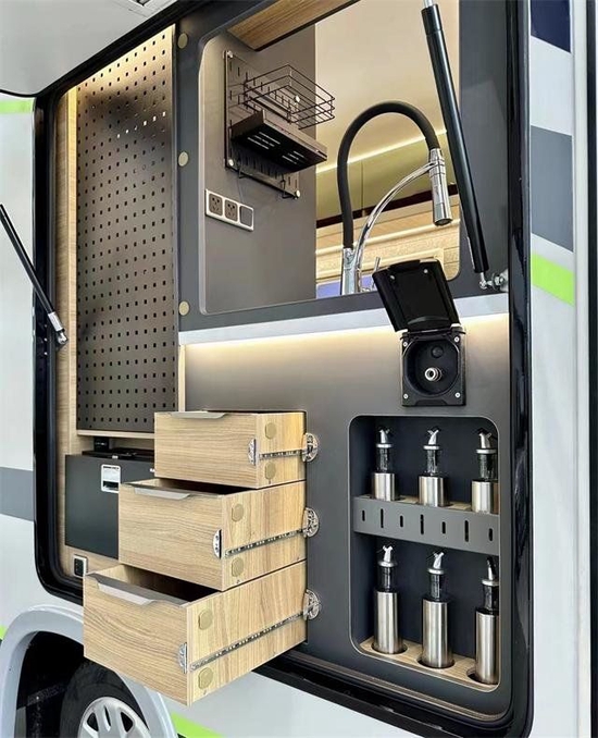 厨房区域配有不锈钢水槽+软管水龙头,可与外置厨房搭配使用,操作台侧边带有可翻折拓展式桌板,右侧配有多个五孔插座,可用于其他电器的使用。下方多个储物柜可用来放置烹饪所需的餐具和调料,随时拿取十分方便。厨房区一侧还配有一台90LTHETFORD直流冰箱,用来保证食物在旅途中的口感与新鲜程度。