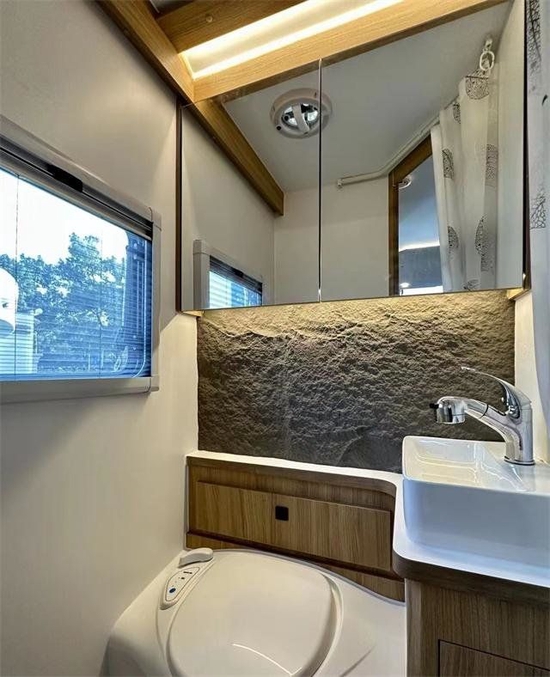 卫生间是一个非常有意思的地方,配备陶瓷洗手盆、抽拉马桶、滚筒洗衣机、储物柜、梳妆镜等设施。梳妆镜下方洗手台上的墙体做了岩板质感的山体设计。休息区采用纵置床设计,床铺尺寸为2000×1200mm,可以容纳双人休憩。床铺侧面配有车窗、床头阅读灯、充电口等,方便车主娱乐或阅读使用。顶部配有储物吊柜,可以收纳日用物品。该车提供了125L清水箱、85L灰水箱、48V250Ah锂电池、5000W逆变器及600W太阳能等设施,满足户外旅行用水用电需求。