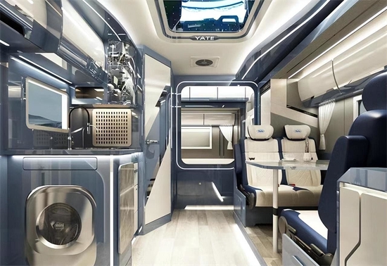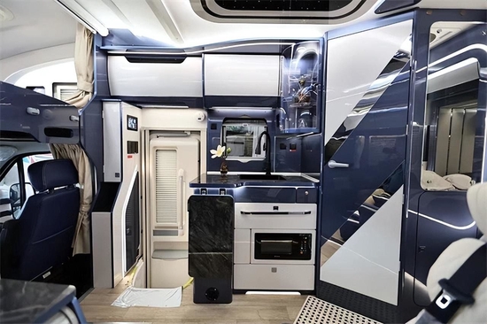 会客区的亮点是配备两张蓝白相间的独立式航空级座椅,具备电动六项调节及腿托调节,具备通风、加热、按摩功能,加上宽大的包围式头枕带来了极佳的长途乘坐体验。厨房区仿石材纹理的操作台面,台面放置了不锈钢水盆、高弯抽拉水龙头和台上式电陶炉 ,此区域还放有大宇15L微波炉、3kg烘干洗衣机和英得尔152L冰箱 。