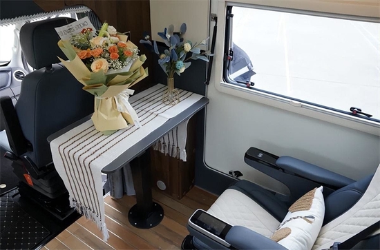 车内设计以深色板材为主,单拓展后上门总体来说空间还是很宽敞的,总体布局从前往后依次是额头床、大会客区,卫生间与厨房。车内地板采用柚木地板,额头床采用乳胶床垫,保障居住品质与舒适度。会客区采用单个航空座椅(阿尔法顶配 通风 按摩 加热),前方配小桌板,搭配副驾驶座椅与侧边的长条沙发,可以组成一个大的会客娱乐空间。客厅区域还包含了宾狗投影仪、50寸电动幕布、JBL同轴6.5寸音响等。