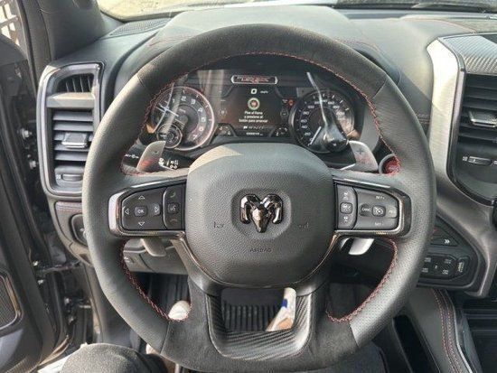 23款道奇公羊霸王龙TRX1500 家族高大威猛的造型设计,同时细节部分融入了更多高性能元素,包括经过黑化处理的前格栅,引擎盖两侧的黑色进气口,以及为了容纳巨大的机械增压器而设计的通风口等等。