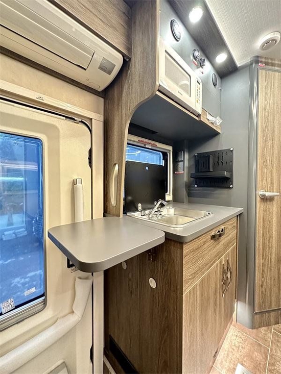 车舱门顶部带有一个氛围灯,车门顶上还赢藏了车载空调,位置刚好合适,但是又十分的美观。空调采用了三菱的1.5P直流变频静音空调。车门边上的是厨房区域,厨房区域带有基本的不锈钢洗菜盆,微波炉,还一个米家的电磁炉。该车带有152升的赛德福超大容积冰箱,不用担心食物没有地方放。