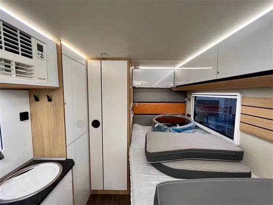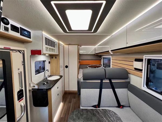 会客区为了打造舒适便利的车内休憩区,采用L型沙发座椅设计,空间利用率更高。除此之外,还配备可升降式餐桌,不仅能满足用餐需求,降下后更可拼成一张尺寸可观的沙发床。此外,沙发内侧墙壁还设计有外推窗和储物柜,可方便储存生活用品。更令人惊喜的是,车顶还配备了氛围灯,为休憩区烘托了温馨的氛围。