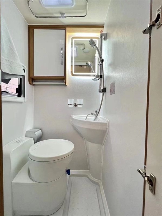 车厢尾部右侧的卫浴间,是一个固定式的独立卫生间,它采用了良好的防水防漏系统。为了让您在旅途中享受更好的体验,卫浴间内配备了洗手池、水龙头、淋浴花洒、旋转盒式马桶、化妆镜等一应俱全,让您和家人的需求都能得到充分满足。同时,车上还配备有燃油暖风系统,24小时为您提供热水,温暖身体的同时也温暖了心灵。