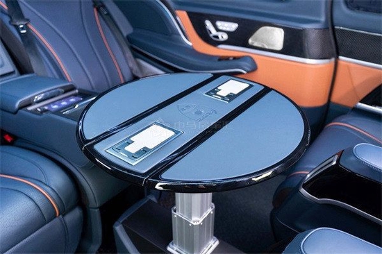 环绕式的驾驶舱主色采用沉稳的蓝色,配色采用跳跃的爱马仕橙,一个低调和谐一个明艳张扬,极度舒适的撞色,奢华稳重不失时尚。豪华一体式S级中扶手箱 定制13L冰箱,让你在炎炎夏日的郊外也能喝到清凉可口的饮料。后部电源接口、USB接口、储物盒、后舱空调控制面板,符合人体工学,高低适中,还有制冷功能,集多种功能为一体。