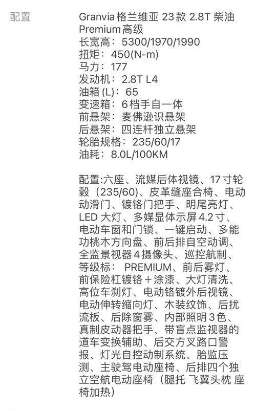 具体配置:22款格兰维亚2.8柴油:六座、流媒后体视镜、17寸轮縠(235/60)、皮革缝座合椅、电动滑门、镀铬门把手、明尾亮灯、LED 大灯、多媒显体示屏4.2寸、电动车窗和门锁、一键启动、多能功桃木方向盘、前后排自空动调、全监景视器4摄像头、巡控航制、等级标:PREMIUM、前后霉灯、前保险打镀铬+涂漆、大灯清洗、高位车刹灯、电动铬镀外后视镜、电动伸转缩向灯、木装纹饰、后扰流板、后除窗雾、内部照明3色、真制皮动器把手、带盲点监视器的道车变换辅助、后交方叉路口警报、灯光自控动制系统、胎监压测、主驶驾电动座椅、后排四个独立空航电动座椅(腿托 飞翼头枕 座椅加热)雷测2382#[更多车型配置 最新行情 分期政策,请咨询大路汽车张经理18522604299(同微信),关注朋友圈 每天更新平行进口新款车型 配置 实车照片及最新优惠政策。]