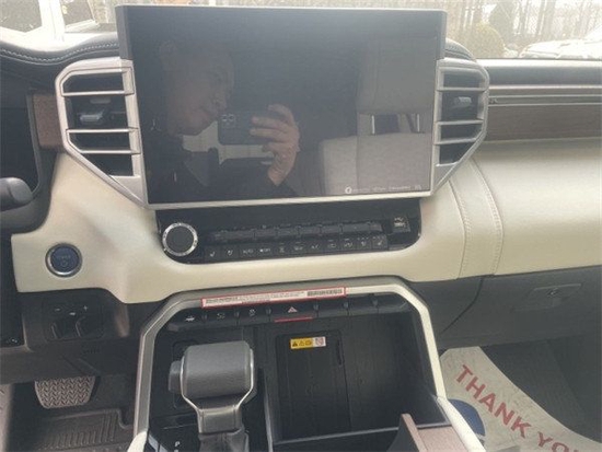 2023款丰田红杉内饰采用了人造木板或光面漆装饰。座椅材质可选择织物、SofTex、皮革、TRD Pro Softex 和半苯胺皮革。根据不同等级,中控屏尺寸从8英寸到14英寸不等,配备了Toyota Audio Multimedia 系统,拥有无线 Android Auto 和 Apple CarPlay功能。