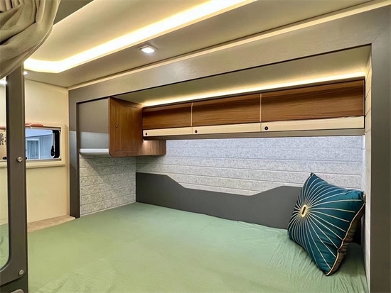 进口依维柯New Daily底盘打造,驾驶室配置了主副驾驶两张座椅,标配有空气减震。多功能方向盘、10.1寸驾驶室导航屏倒车雷达、六轮胎压监测、七路监控、ESP9.2车身电子稳定系统等,保障行车安全。额头床尺寸为2180×1500 mm,整个区域做了软包的处理,细节方面配置了床帘、阅读灯等,床板的下方内嵌了一台32英寸的智能电视。