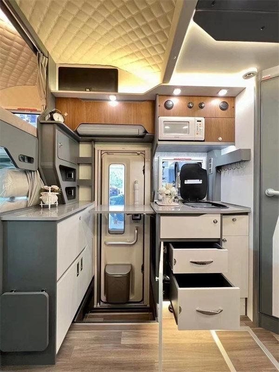 车厢内高度为2020mm,内部尺寸宽阔,高个人群进入车内完全不用担心有碰头的风险。内饰采用欧洲工艺家具设计,整体选用免漆家具板+进口地板革+防火板台面等,保障内部高品质的居住使用空间。还有一点值得说道,本车内部安装有房车智能APP控制系统,实现房车的智能使用。车主可通过房车智能APP,对车内的电器进行远程遥控,在房车中实现也可智能家居。