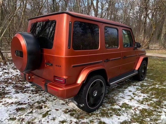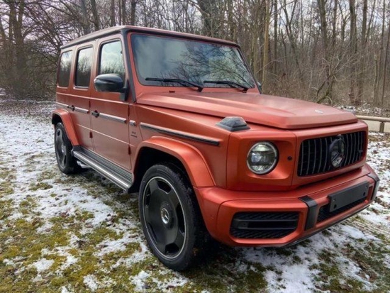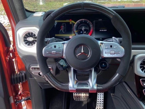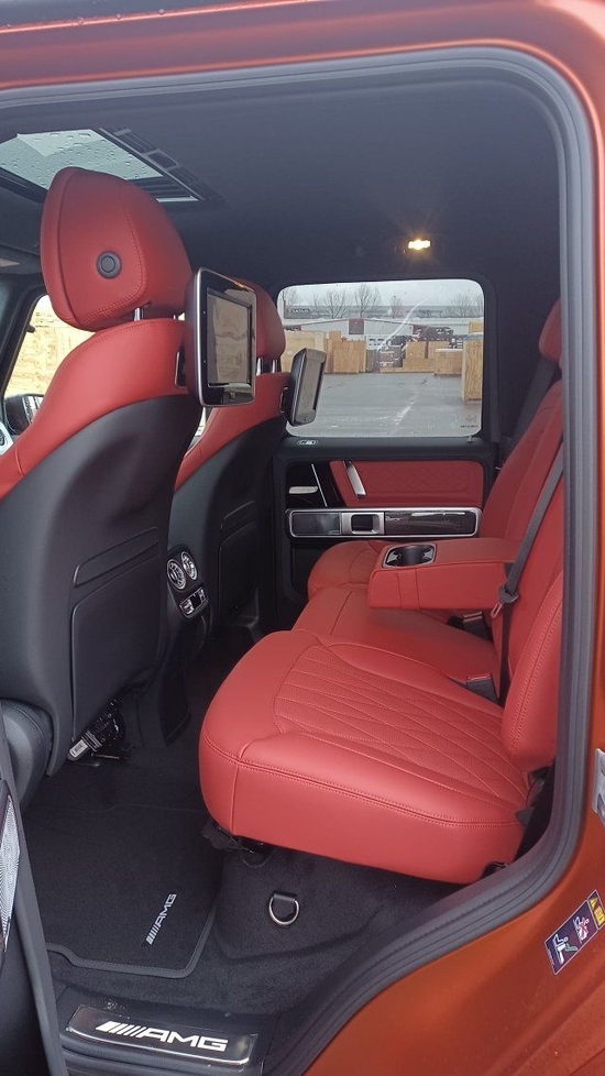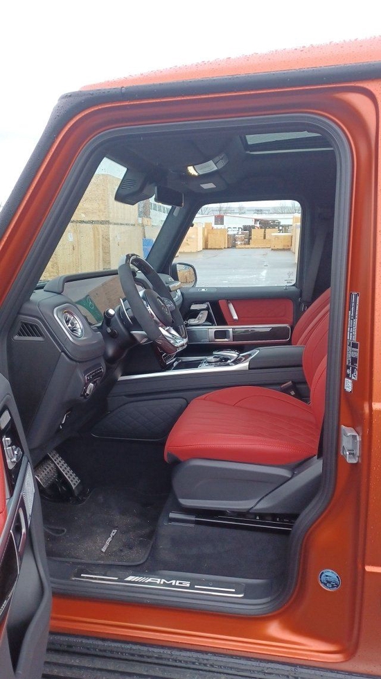 滑动天窗,G Manufaktur哑光橙特殊定制油漆,半苯胺红色带菱形网格主动多轮廓座椅,独家内饰座椅舒适包,碳纤维AMG方向盘带GT弹射键、排气切换,碳纤维内饰, AMG高性能红色卡钳,22寸同迈巴赫款大屏熏黑轮毂,后排娱乐,暗夜加强包(大暗夜),驾驶员辅助包(雷测,360环影,盲点监测,交通标志辅助),Burmester®环绕音响系统,拖钩,后排私密玻璃,黑色哑光后视镜壳,64色氛围灯,自适应阻尼悬挂