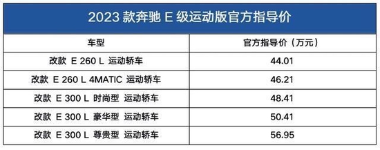 2023款奔驰E级运动版共计推出5款车型,改款 E 260 L 运动轿车(指导价44.01万元)、改款 E 260 L 4MATIC 运动轿车(指导价46.21万元)、改款 E 300 L 时尚型 运动轿车(指导价48.41万元)、改款 E 300 L 豪华型 运动轿车(指导价50.41万元)、改款 E 300 L 尊贵型 运动轿车(指导价56.95万元)。