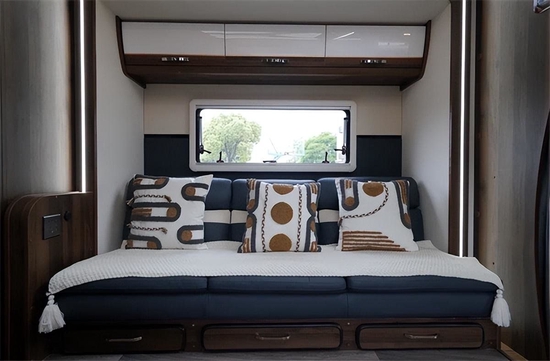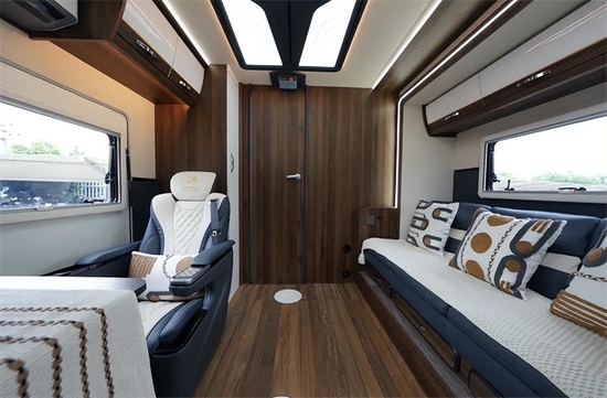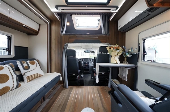 车内设计以深色板材为主,单拓展后上门总体来说空间还是很宽敞的,总体布局从前往后依次是额头床、大会客区,卫生间与厨房。车内地板采用柚木地板,额头床采用乳胶床垫,保障居住品质与舒适度。会客区采用单个航空座椅(阿尔法顶配 通风 按摩 加热),前方配小桌板,搭配副驾驶座椅与侧边的长条沙发,可以组成一个大的会客娱乐空间。客厅区域还包含了宾狗投影仪、50寸电动幕布、JBL同轴6.5寸音响等。
