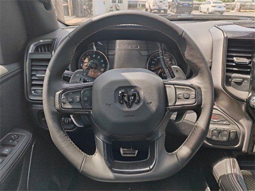2023款道奇霸王龙TRX在内饰部分进一步强化了其高性能版本的形象,中控台和座椅随处可见的TRX标识便是最好的例证。同时,作为道奇家族的旗舰车型,新车还配备了12英寸竖置中控屏幕,除了支持蓝牙、导航和车载Wi-Fi等常见功能,还支持Apple CarPlay和Android Auto手机映射