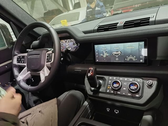 2023款路虎卫士内饰设计变得不再简陋,中控台使用了涂层镁合金材质,进一步提升了内饰的耐用性,新车使用了全新的四辐式方向盘、12.3英寸全液晶仪表、10英寸中控屏幕,空调旋钮带有液晶显示屏,电子挡把位于中控屏下方,使用更加顺手。