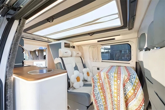 升顶完成之后,可以发现车厢内仍是瑞弗最爱的吸塑开模件,熟悉瑞弗的车友都知道,瑞弗的吸塑开模件都是航空级别的,无异味一体成型,用多久都不变形。内饰做工也显得非常精致,颜色搭配也符合现代年轻人的审美趋势。整车还是瑞弗一贯采用的轻量化、E0级环保型家具材质。