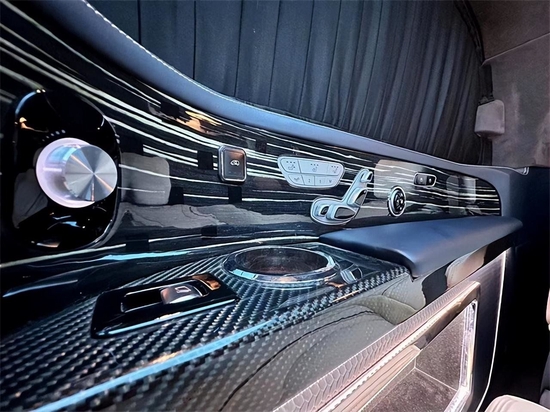 内饰打造称得上别有洞天,稀有的全麂皮内饰风格更加独特高贵。钢琴烤漆饰板进行装饰的中控台更加精致细腻,镀金的涡轮出风口以及线条勾勒出轮廓的走向。中央扶手箱是带储物功能的压缩机冰箱。