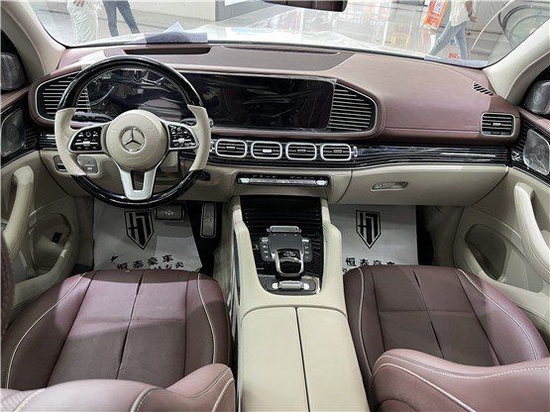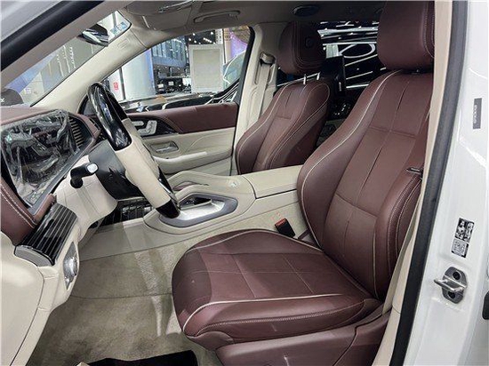 23款奔驰GLS450改装升级四座内饰整体皮饰改成了纯白色的设计,替换了钢琴黑条纹桃木饰板,桃木方向盘,加装了HUD抬头显示系统,主机系统也刷了迈巴赫的开机画面,车内随处可见的迈巴赫标志,打造无出其右的考究质感。