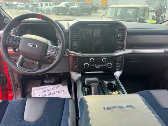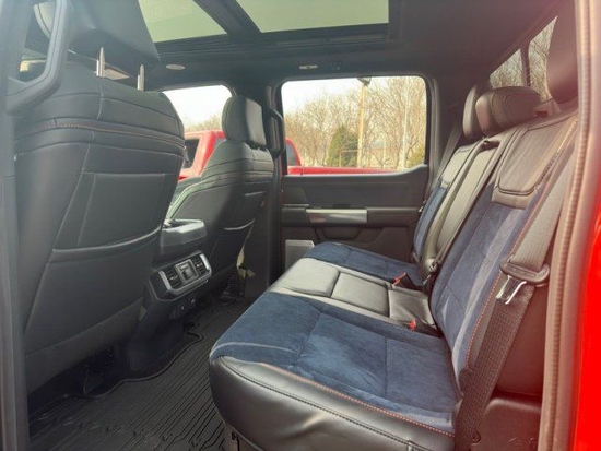 2023款福特猛禽F150的内饰采用独特的中控台和门饰板面漆和真皮包裹的方向盘,方向盘可以上下前后调节。轴距3690mm,拥有宽敞的内部空间,全车蓝黑搭配的电动调节真皮座椅,用豪华舒适来形容一点也不为过。