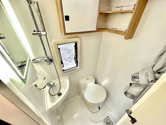 卫生间的空间还是不错的,可以满足一个成年人的正常洗漱。配置也基本齐全,主要有便携式马桶、淋浴花洒、置物架、毛巾架、梳妆镜以及顶部的换气扇。但未配置洗脸盆,这个可以支持选装。毕竟这是一款宇通房车打造的房车,可以享受宇通优质的售后服务。