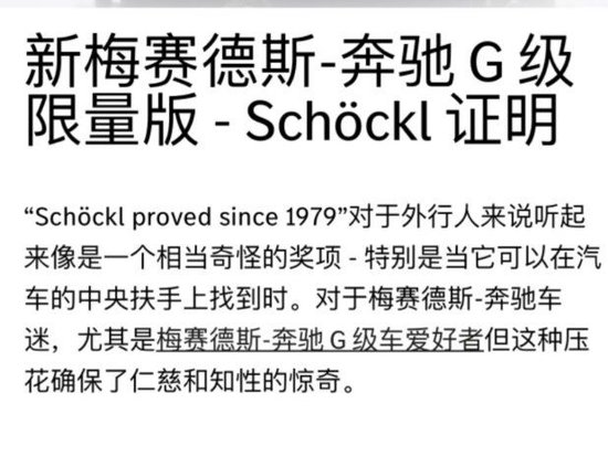灰/咖啡棕SCHOCKL PROVED SINCE 1979纪念版,AMG包,双五幅AMG轮毂,GK1“沙漠”驾驶模式,意大利棕色菱形格子皮,多仿形运动座椅(通风、按摩),驾驶员辅助包(雷测、360度环影),远程摇启(通风加热空调),自适应阻悬挂,带ESP的拖车钩,BSO制动卡钳,100l大油箱,油箱装甲,柏林之声,光速大灯,天窗,无框后视镜,64色氛围灯,空气净化器,四季轮胎(备胎夏季轮胎),宽屏,黑色火焰开孔白蜡木内饰板,隐私玻璃。