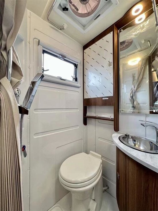 卫生间为干湿一体式布局,高光亮吸塑成型防漏水双地漏浴室与多功能豪华卫浴系统,带来舒适卫浴体验。卫生间设有独立暖风出风口,冬季淋浴也不怕寒冷气温。配备浴帘,有效防止水花喷溅。墙面设有一个防水插座,可为吹风机等电器供电。顶部进口换气扇,有效排出水蒸气与异味,保持卫生间室内清新。在水电配置方面,瑞弗房车V820巅峰版标配了200升净水箱、50升灰水箱、50升黑水箱,电路方面有3000W充逆变一体机、800ah锂电池、570W顶置太阳能板。