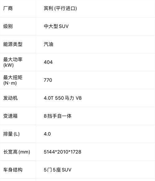 宾利添越 (配置|询价)V8五座 紫银双拼/板球红内饰 撞色头枕刺绣 LED迎宾灯 前舒适包 360环影 通风按摩 急救包 加热三幅单色方向盘 长脚垫 脚感电尾 氛围灯 双色外观 内饰颜色包 氙灯LED大灯雾灯日间行车灯、百年灵时钟、全景天窗、智能卡、电吸门、电尾门、车顶行李架、前后电眼、倒车影像、三幅真皮运动方向盘、前后座椅加热、全时四驱、可变悬架系统、6个气 、底盘升降、巡航定速、胎压监测、上下坡辅助、盲点监测、换档拨片、前大灯清洗系统、自动四区空调、前真皮电动记忆加热腰腿支撑座椅、电动防眩记忆加热折叠后视镜、导航