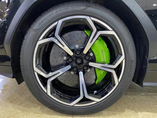 前轮碳陶刹车盘的个头非常惊人,尺寸相当于一台家用轿车的轮圈大小,制动卡钳为前10活塞,后单活塞,并且有六种颜色可供选择,22寸的轮毂装在Urus上面一点也不显大,搭配倍耐力P ZERO轮胎,规格为前285/40/R22,后325/35/R22,当然你也可以选择更大的23英。