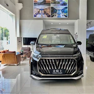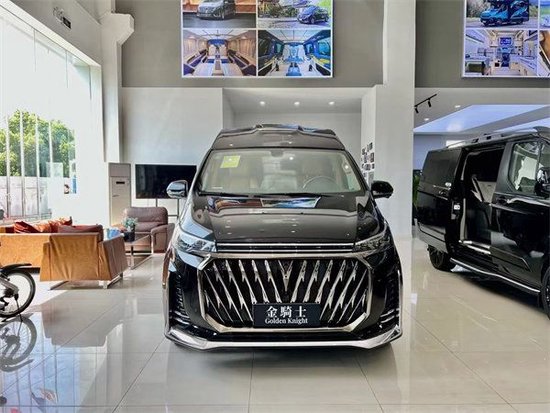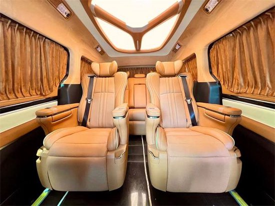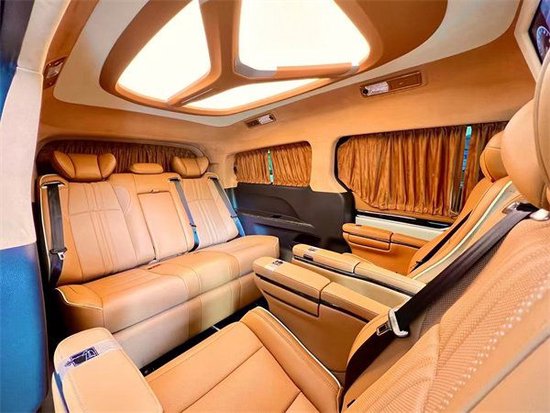 车内采用麂皮绒的软包加上星盾天幕顶灯,整车在看不到的地方,比如四周全部做了隔音的处理,窗户上都加装的是高级私密窗帘,既可以避免阳光的直接照射,维护车内的一个用车环境,也可以很好的保护我们车主的隐私。第三排座椅为标准的电动沙发座椅,可以通过隐藏在靠背中部扶手上的控制屏对座椅的靠背、腿托进行控制调节,必要时可以完全放平,形成一张豪华双人大床。想象一下和你的他(她)一起躺着欣赏这无垠的星空,那是多么的美妙的时刻!整车的后尾部呢,带有一个非常漂亮的尾翼,并且还有金骑士的LOGO。