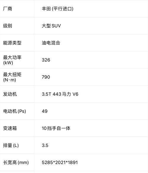 配置方面,3.5TT混动 双涡轮增压V6混合动力,TRD越野包-包括18英寸,TRD越野合金车轮与全地形轮胎,微章越野悬挂 红色TRD发动机启动按钮,电子控制锁定后差速器,多地形选择(MTS),爬行控制(CRAW),和下坡辅助控制( DAC),电动折叠第三排座椅,电尾门,120V后舱交流电源和400V货区交流电源。,拖车技术包,全天候地板衬垫包(全天候地板衬垫,全天候货物垫)