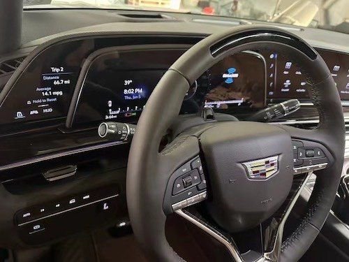 23款凯雷德内饰奢华感和科技感并存,仪表台上有一个大约 38 英寸双联屏,凯迪拉克称其像素密度是 4K 电视的两倍。其中包括一个 14.2 英寸的液晶仪表盘,当导航处于激活状态时,可以利用增强现实技术提供额外的信息