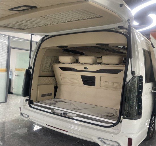 全新开模 新中栻多款改装方案 参数配置: 车身尺寸:长:5915mm、宽:1950mm、高:2280mm 发动机:V6自然吸气发动机 变速箱:6挡手自一体 马力:282匹 驱动方式:前置后驱 排量:3456ml 轴距:3860mm 油箱容积:65L 整车质量:2530KG 改装具体配置: 外观:埃尔法 (配置|询价)款包围(雾灯、大灯及总成) 镀铬中网、镀铬后视镜、镀铬牌照架、镀铬门把手 16英寸皇冠版锻造轮毂 内饰: 触屏款航空座椅(带电动头枕)+沙发床(中央控制屏) 镂空中国风顶灯与侧壁灯带、吧台 铝制定制款带灯迎宾踏板 38.5寸曲屏吸顶电视、9寸中控显示大屏(导航+环影) 主副驾真皮座椅、通风、加热、主6副4电动 全车隐私膜、全车加强版隔音、全车NAPPA真皮包覆 JBL音响、电中门、高端定制版木地板、黑钢琴漆方向盘 中央扶手双开门冰箱、空调管道、暖风机改造、百叶窗等配置。