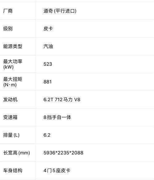 23款霸王龙 黑黑 2级包 高级安全包 金属漆 全景天窗配置:TRX标配: 6.2升V8机械增压发动机 采埃孚8hp95变速箱 srt高性能过滤进气口 srt高性能黑色排气弹射起步控制系统 srt测试监控系统 高性能散热 独立机油散热 全时四驱带后差速锁 全地形驾驶模式带陡坡缓降 德纳全浮动60后桥带独立减震 倍斯登黑鹰带氮气罐电控避震 加强铝合金前悬挂13英寸 加强五连杆螺旋弹簧14英寸 高性能刹车系统 325 65R18全地形轮胎 复合材料加宽前后叶子板 复合材料机盖后尾门 led大灯 液晶仪表 12寸屏幕 车身同色门把手 胎压监测 高级真皮翻毛内饰 头枕四项调节 防眩目 电动座椅带腰部支撑 全长高级地板控制台 座椅加热 方向盘加热 led环境光照明 哨兵模式 货箱led照明 可调油门踏板 雨量感应雨刮器 熏黑led大灯 倒车影像 后座储物盒 车库门远程控制 250安发电机 trx版本铭牌 拨片换挡 选装包: trx2级包: 19喇叭哈曼卡顿 盲点检测 可切换流媒体后视镜 座椅记忆 前后排座椅通风 后排座椅加热 抬头显示 平底翻毛方向盘 led雾灯 前后雷达 远程启动 遥控尾门 环影 拖车制动控制 无线充电 无钥匙进入 400w逆变器 33加仑油箱 carplay 主动降噪 TRX2级包 全景双层天窗 高级安全包(行人紧急制动 自动巡航定速及自动停走功能 车道保持辅助)