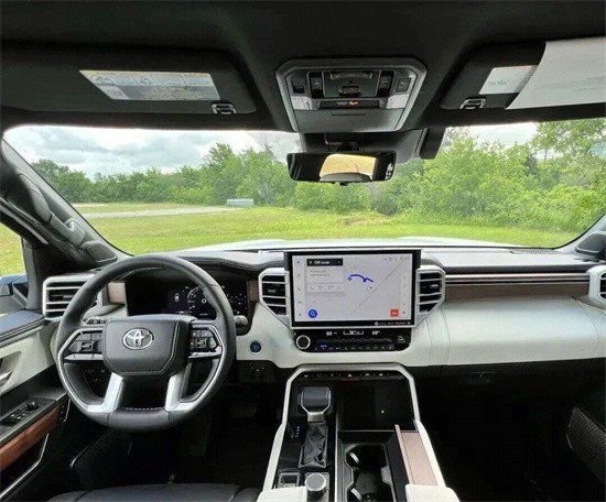23款丰田红杉车内采用了大量软质材料包裹,部分区域还加入了缝线处理,显得档次感和质感十足。另外车内采用的是四辐式多功能方向盘,并保留了很多物理按键,足以满足驾驶时想要的操控感,车内的科技氛围是通过12.3英寸的全液晶仪表盘和14英寸的中控屏来实现的,中控屏两侧的空调出风口,虽然没有采用时下流行的贯通式设计,但在中控台上对称排列也别有一番风味。另外顶配Capstone车型的内饰将会采用更加豪华的黑白配色方案,并搭配胡桃木装饰面板。