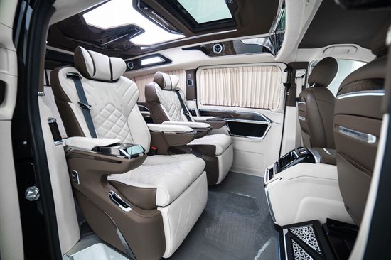 整车内饰实木+皮革手工包覆,一体模具化生产,前舱沿袭奔驰经典布局,智能科技感悬浮中控屏,双炮筒仪表盘以及跑童装空调出风口,经典又不失新意。后舱二排配备了两个非常豪华的头等舱航空座椅,头枕、腰背、腿托多项电动调节功能,搭载通风加热以及多模式按摩等功能,宽宏的空间,还可支持深度睡眠放松的平躺模式,人离开后,还可一键复位。