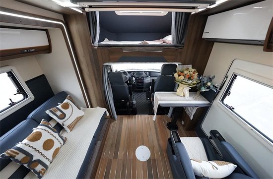 车内设计以深色板材为主,单拓展后上门总体来说空间还是很宽敞的,总体布局从前往后依次是额头床、大会客区,卫生间与厨房。车内地板采用柚木地板,额头床采用乳胶床垫,保障居住品质与舒适度。会客区采用单个航空座椅(阿尔法顶配 通风 按摩 加热),前方配小桌板,搭配副驾驶座椅与侧边的长条沙发,可以组成一个大的会客娱乐空间。客厅区域还包含了宾狗投影仪、50寸电动幕布、JBL同轴6.5寸音响等。