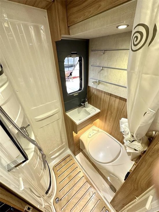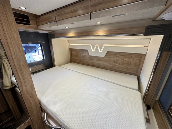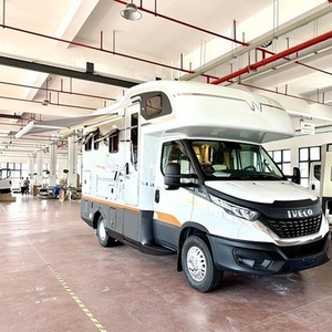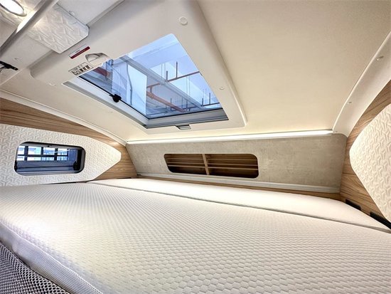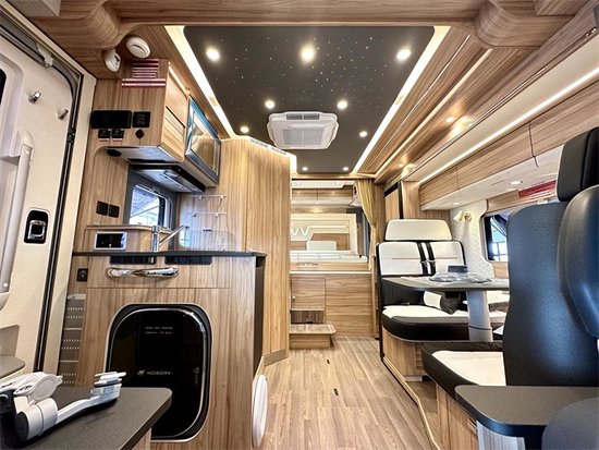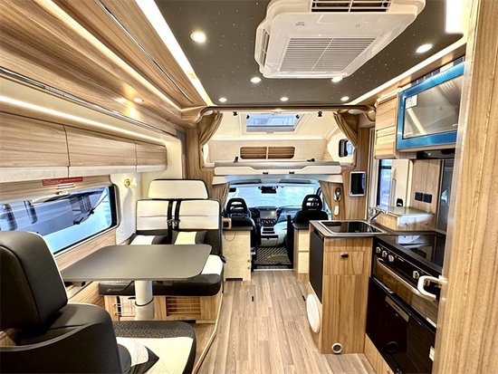 车内生活空间采用C型房车经典的“额头床+卡座拼床+尾横床”三床布局,睡眠空间丰富,可容纳5-6人旅行休息;内饰采用豪华原木系的公寓风设计,色彩丰富,温馨舒适,顶部还有星空顶造型设计和灯光系统,使整个空间更具高级感。会客区设有对向沙发卡座,可以满足4人乘坐休息,中间配备有电动升降餐桌,休息时也可以拼床;卡座上方设有储物吊柜,方便收纳一些常用的物品。