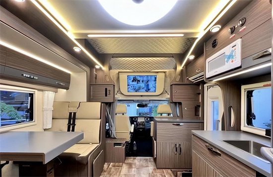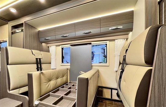 车内选用进口E0级的板材,环保系数高的同时也保证了整车的质感。整车使用了传统的风道设计,可以形成一个循环的空气系统,将新鲜空气循环往复地输送到车内各个角落。会客区采用经典的四人对坐卡座样式,超大外推窗,增加了自然光照入车内的面积,座椅的上方有丰富的储物空间。升降桌降下与对坐沙发可以拼成一张1900*945(mm)的临时床位。