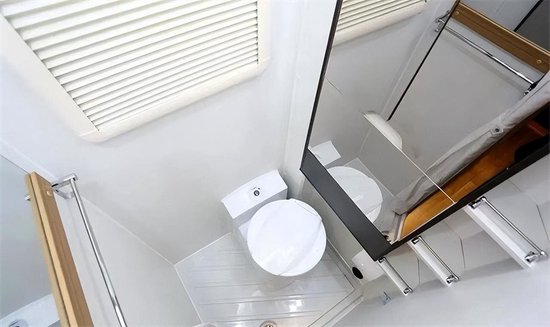 卫浴间独立式设计,配有专用马桶、毛巾架、置物格、储物柜,满足日常的洗浴和如厕需求。车尾拓展区床铺尺寸为2205*1400mm,内部采用环保软包材质包覆,即使同样采用三面环窗的布局,在静谧效果上也能强出一筹。此外,床铺内还安装有阅读灯、220V电源插座、USB接口、隐私帘以及储物格等日常生活常用的实用设备。