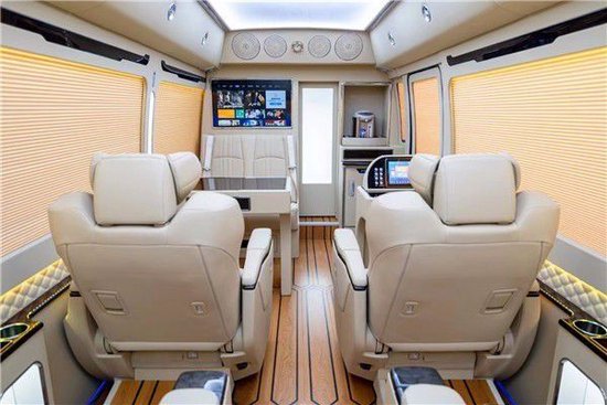 丰田考斯特车内配备了高档OTTOMAN意大利真皮航空座椅,并配置了电动脚托、电动靠背平躺。丰田考斯特内部航空座椅前部可配备一张真皮汇报席办公桌,桌面配以多媒体数据转换接盒,实现多功能移动办公与会议展示。丰田考斯特改装商务车内饰的改装上,还有许多不同的细节的设计。