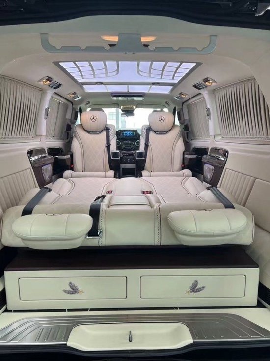 后排的座椅采用电动沙发床的设计,可以电动放平成一张双人床。实用性非常高。与第二排座椅之间可以加装隐藏式的小桌板,满足了家庭出行的娱乐需求以及商务出行的会议谈判空间。实用性非常高。