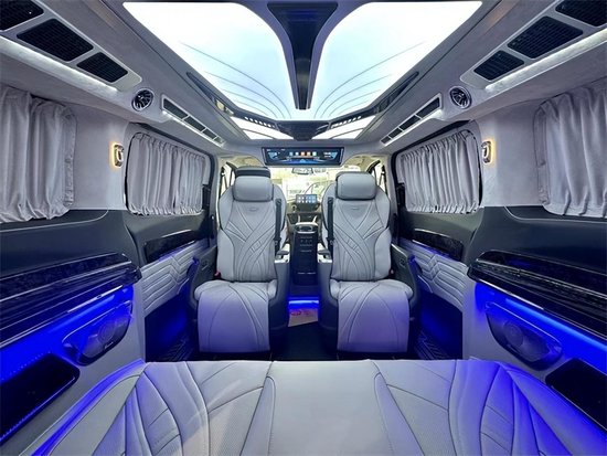 二排航空座椅具备通风,按摩,加热,旋转,腿托等功能,其中人体工程学6点位智能气动按摩,旅途的生活也能多一些享受与自在。三排电动调节,配有无线充电,它既可以是一个沙发床,也可以由两个独立的座椅所组成,可满足不同用车的需求。定制顶灯,有多种颜色可以调节,适应车内不同的用车氛围。
