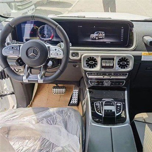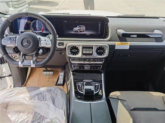 23款奔驰G63 (配置|询价)车内越野气息十足,多处硬朗设计使其具有硬派越野车风格。采用现下流行的双连屏设计,让车内还具有一些科技感。双连屏界面显示清晰,易读性不错。方向盘为三辐式式设计,除了常见的功能按键区域之外,还在下方加设了一些按钮,驾驶仪式感十足,也可以让驾驶员专注力提升,不分神去操作其他功能。方向盘支持各种导航、电话、以及娱乐功能的控制按键。中控区域还采用了AMG车型独有的模拟时钟IWC设计,时钟中的数字和指针均采用纯金属材质,质感不错。