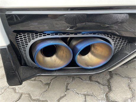 轮毂采用了多幅式双色造型搭配大尺寸刹车盘以及橙色卡钳,进一步增强了运动气息。尾部造型方面车顶配备有尺寸比较大的尾翼,分体式尾灯组采用了圆形设计点亮后很有辨识度,梯形牌照框采用了内凹式设计,点缀除了车尾的层次感,下包围部分配备有造型比较激进的扩散器,排气管采用的式双边共4出布局。