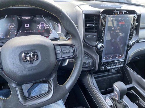 2023款道奇公羊RAM霸王龙、内饰部分进一步强化了其高性能版本的形象,中控台和座椅随处可见的TRX标识便是最好的例证。同时,作为道奇家族的旗舰车型,新车还配备了12英寸竖置中控屏幕,除了支持蓝牙导航和车载Wi-Fi等常见功能,还支持Apple CarPlay和Android Auto手机映射。
