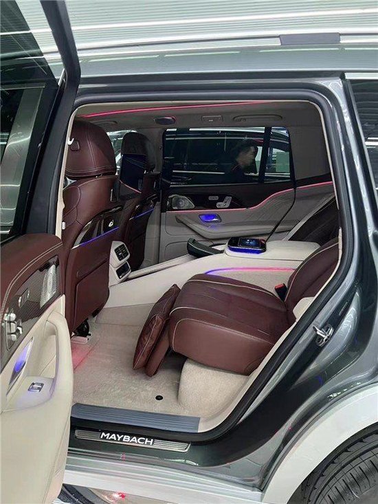 23款奔驰GLS450改装升级四座后排的空间舒适度大大提升,结束了后排空间小的问题。后排乘客配有一块7寸的小平板,可以控制64色氛围灯,座椅按摩以及其他舒适性功能只需一个按钮就可以变成一个躺椅,能多角度电动调节,提供了通风、加热、按摩等功能。