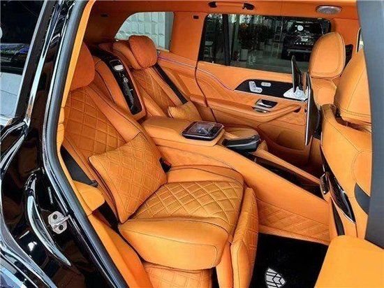 2023款奔驰GLS450改装迈巴赫后排座椅改成了两座座椅,安装带平板控制、无线充电器、小桌板的贯穿长条马鞍,构建长途旅行中恬静的车内氛围及充分放松的乘坐体验。