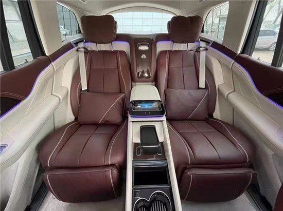 迈巴赫GLS600后排带有全景天窗、独立的多媒体娱乐系统、独立分区空调,车内香氛装置,可选车载冰箱、后排小桌板。整车都是夹层玻璃,搭配整车降噪组件隔音非常好,车内带64色氛围灯,26喇叭的柏林之声音响系统。